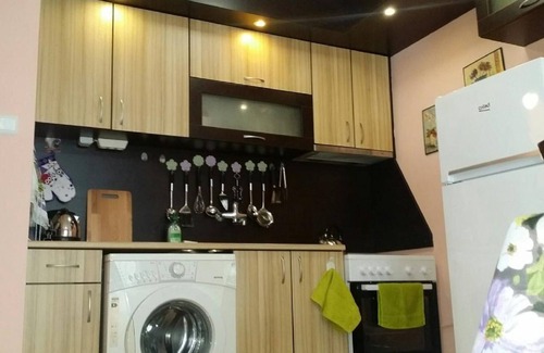 por satélite, uma cozinha equipada com um frigorífico e um forno,