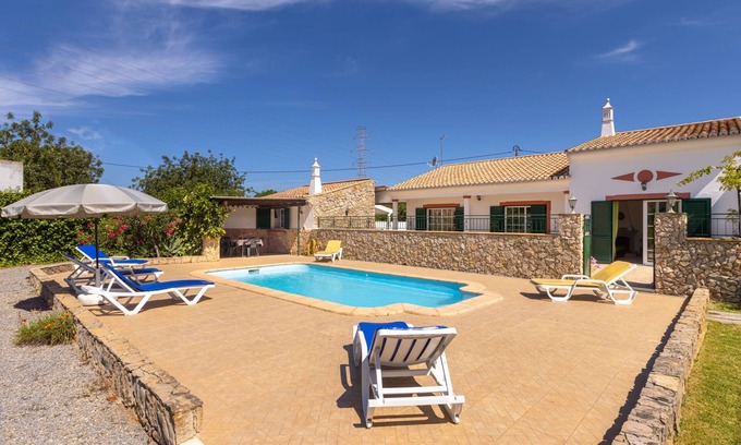 House "Do Castelo", built in 2007, surrounded by meadows and fields. 5.5 km from the centre of São Brás de Alportel, 14 km from the sea, in the countryside. Private: natural state property 1'800 m2 (fenced) with lawn and wildlife garden, orchard, swimming pool (6 x 3 m, depth 100 - 180 cm, seasonal availability: 01.Jan. - 31.Dec.) with salt-electrolysis pool-cleaning system. Shower/WC in the pool area, pool house with cooking stove, parking on the premises. Shop 5.5 km, supermarket 5 km, restaurant 4 km, bus stop 100 m, sandy beach "Fuzeta" 14 km, outdoor swimming pool 5 km, indoor swimming pool 6 km. Tennis 6 km.
