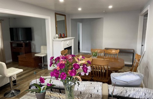 This is our home. It’s a 2 story upper unit sleeps up to 12 people. 2 bathrooms, 4 bedrooms. 1 bedroom on upper level has two double beds and the other 2 bedrooms have a double bed. Main floor bedroom has a double bed. Double futon in the living room. Full kitchen, Washer and dryer, A/C, WIFI, Flatscreen SMART tv, 6 communal BBQs and communal fire pit. SPACE FOR 3 CARS ONLY - no extras.