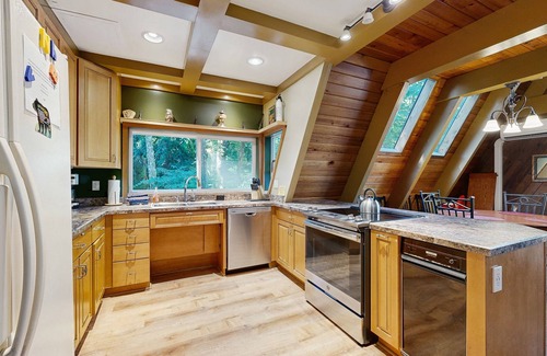 With high, triangular ceilings, exposed wood, and forest-friendly furnishings, this A-frame vacation home feels like a ski cabin in the woods! The living room is open and relaxing with soft leather sofas, a TV, and a woodstove to warm your toes! The tall windows provide natural light. The designated chef will adore the kitchen with full amenities, including a dishwasher and a lovely view from the sink. Spend some time here whipping up a delicious meal for your group, or break out some appetizers while you chat over the breakfast bar! The fun continues with a second living space with high ceilings, a TV, more fabulous seating, and superb views of the surrounding forest.