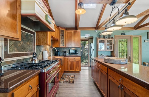 The living area features a beautiful original stone wood-burning fireplace that opens to the upgraded, modern kitchen. The kitchen is fully stocked with cooking equipment but does not have a dishwasher. There is also a large outdoor propane grill for your use. The cabin has two bedrooms upstairs and one bedroom downstairs with its own private bathroom and separate entrance. Plenty of games like giant Jenga, Yahtzee, and a dartboard are provided for entertainment. This home is ideal for group getaways or family get-togethers. The owners adore this vintage yet fully modernized cabin and are happy to share their 'piece of paradise' with you.