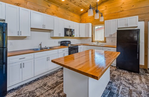 Absolutely perfect for couples, large families, or groups of friends, this cluster of charming cabins is just waiting to assist in making the best memories. This unique layout will give everyone privacy when need be with four separate cabins with king beds to reside in each night and the main cabin with all of the conveniences needed for a comfortable stay. Inside the main cabin you will find tall ceilings, a large living area complete with multiple sofas and board games, and a full kitchen with all of the major appliances and utensils needed for any recipe to be whipped up with ease. Plus, the accommodating dining table will be ideal for gathering each evening or hosting game nights for all to enjoy. If you are looking to have a more casual cookout, the private gas grill on the deck will come in handy as the sun dips below the trees!