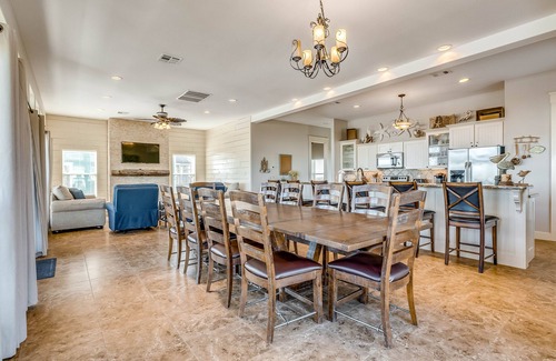 With plenty of room for an extended family or large travel group, this exquisite, beachfront home is sure to be the repeat vacation location. Offering jaw-dropping, panoramic views, coastal chic touches, and plenty of space for everyone to spread out and relax, this home is a Galveston paradise. Prepare full-course meals in the bright, full kitchen while watching the pelicans pass by. Dine together at the large table with seating for 10, with overflow seating at the island, and then gather in the open living area for socializing or movie nights. Outside, you'll find an enormous, fully-furnished covered deck, an upper-level balcony, and a lower level with plenty of picnic tables for warm-weather cookouts. For sleeping arrangements, this home features four comfortable bedrooms ranging from elegant king suites to a kid-friendly space with built-in bunks.