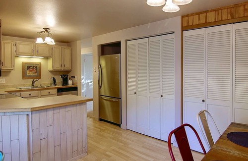 Mountain style tongue and groove walls in the kitchen make this home feel like a lodge. The kitchen is on the top level, has stainless steel appliances, a dining table with 6 chairs and great views of the slopes. It also has a desk with two chairs to comfortably seat 8 total and is fully equipped with everything you need to cook a great meal. Outside the kitchen is the living area which features views of Emerald Mountain, plenty of comfortable seating and a large flat screen TV.
