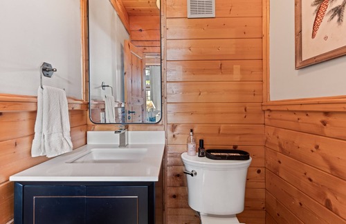 A haven of peace and tranquility, the primary bedroom boasts its own private outdoor lounge area and a spa-like ensuite bathroom. Indulge in luxurious moments of self-care while utilizing the dual sinks, walk-in shower, and marvelous corner tub. Rest assured that everyone's comfort is catered to as each bedroom is adorned with soft linens, custom decor pieces, and central air-conditioning. The perks don't end there though! Other key features of Sapphire Elegance include; knotty pine in all the right places, a library, children's items like a Pack-N-Play and games, a separate laundry room, and a downstairs family room for greater company with a poker table, TV, comfortable furnishings, and fireplace.