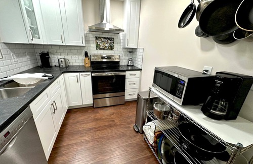 Modern Amenities: Enjoy a fully equipped kitchen, plush bedding, towels and a cozy living area with streaming services for movie nights. Everything you need for your stay. Just bring personal items and food.