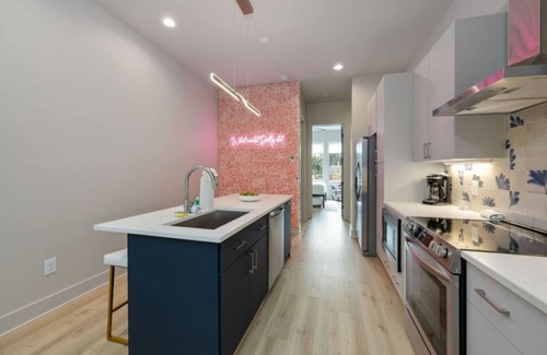 This stunning townhome features four bedrooms and four and a half bathrooms, offering plenty of space for your group. You'll sleep comfortably with three queen beds, two twins, and a luxurious king bed in the master suite. The open-concept kitchen and living area provides ample room for everyone to gather and enjoy your stay. Fun, unique decor provides a backdrop fit for a country queen! Start your day with coffee on the beautiful rooftop, or kick off your night with drinks and a game of cornhole before heading to Broadway. Experience the best of city living while savoring the tranquility of a peaceful neighborhood.
