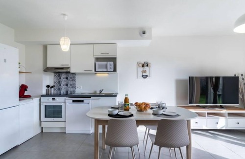 "Domaine des fées 1", 3-room house 60 m2 on 2 levels. Beautiful furnishings: living/dining room with TV (flat screen). Exit to the patio. Open kitchen (oven, dishwasher, 4 ceramic glass hob hotplates, toaster, kettle, microwave, freezer, electric coffee machine, Capsules for coffee machine (Senseo) extra). Shower/WC. Upper floor: 1 room with 1 french bed (160 cm, length 190 cm). Exit to the balcony. 1 room with 1 french bed (160 cm, length 190 cm). Bathroom, sep. WC. Electric heating, air-conditioning. Patio 60 m2, south facing position. Terrace furniture, barbecue. Facilities: washing machine, dryer, iron, baby cot for up to 2 year olds, hair dryer. Internet (WiFi, extra). Parking space n 35. Please note: non-smokers only. 1 small pet/ dog allowed. Smoke alarm. Offer by a private individual according to Art. 155, IV of CGI. 830680007197Q