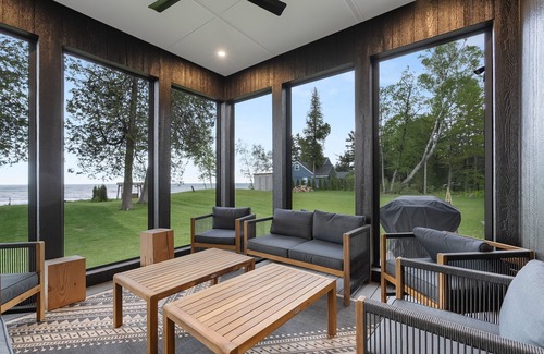 A modern lake house in the town of Clay Banks awaits you. This serene retreat offers breathtaking views of Lake Michigan from expansive windows in every room and a secluded back deck, perfect for embracing the magic of lake life. The home features a huge back deck with dining for eight, an outdoor lounge area, and a fire pit near the water for unforgettable evenings. Enjoy outdoor amenities like a hot tub, a charcoal grill, a screened porch, kayaks, a ping pong table, and even a private beach.