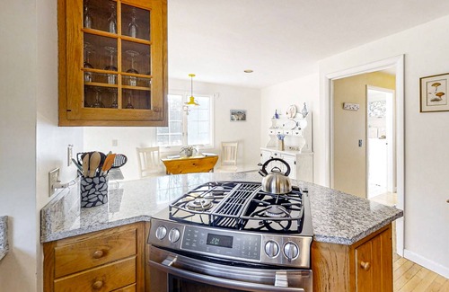 Relax in the spacious living room, furnished with two sofas, armchairs, and a gas fireplace. Pick your favorite film from the vast array of DVDs and have a movie night on the 31-inch TV. An adjacent sunroom boasts a sofa and rocking chair, as well as a dining table. Whip up tasty vacation meals in the open kitchen, outfitted with new appliances, granite countertops, and all the kitchenware needed. Enjoy morning coffee at the two-person breakfast nook. Gather in the sunroom at the unique live-edge wooden dining table for six and take in beautiful views of the waterfront backyard.