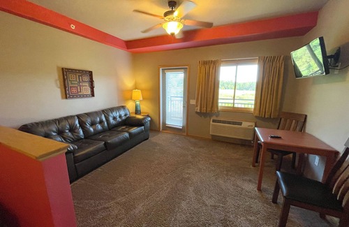 This 500+ square foot Cedar Stone Room features two queen-size beds and accommodates up to 6. Included are a leather sleeper sofa (queen size), table with seating for two and two 32" TVs. For added guest convenience, this unit offers a compact refrigerator, microwave and 4-cup coffee maker (complimentary coffee and tea provided). Additional amenities include a stocked bathroom, toiletries and hair dryer. Enjoy the view of Spring Brook's golf course on the spacious balcony with provided outdoor seating.