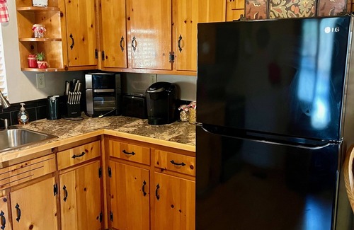 A full kitchen with cooking and eating utensils, a coffee pot, microwave, toaster, blender, crock-pot, instant pot, and more are provided.