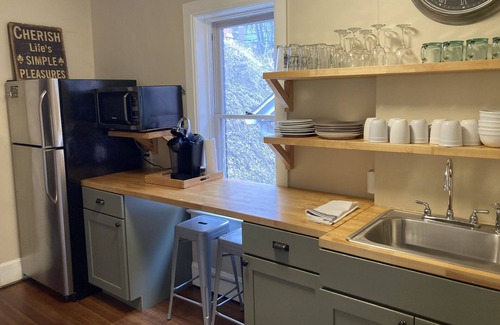 Enjoy a romantic river view and the best Galena has to offer, all right Downtown. This house has four bedrooms, a kitchenette, a full kitchen, two full bathrooms, a great room with 65" TV, bar, front porch and back deck with furniture and grill. Sleeps 10 with sleeper sofa. You don't need your car while you're staying here, since you can walk less than a quarter mile north on main street and be among dozens of restaurants, bars and shops.