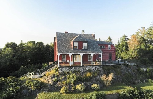 Affectionately referred to as 'Tip Top House', this private downtown rusticator cottage is perched amongst the trees on top of a ledge overlooking the Fox Islands Thorofare. This unique summer home was designed and constructed in the late 1800s by a well-acclaimed architect and later retrofitted for modern living. The spacious property is amongst the largest lots downtown and adorned with original stone walkways, brick terraces, flower beds, and more! Tip Top House offers an abundance of privacy, charm, and breathtaking views, at less than a five-minute walk to downtown amenities!