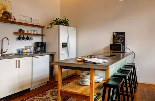 Main Office Lofts are located in a renovated commercial building in the heart of Downtown Lynchburg Virginia. The Panel downtown Loft has character & modern amenities in 850sf of space. Very comfortable queen bed, full bathroom, kitchen with microwave, fridge, stove and dishwasher, comfortable queen sleeper couch, and more The bedroom is separated from the living room by the panel wall.