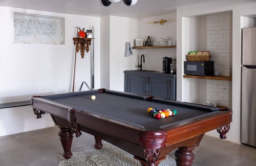 One of downtown State College's most historic homes, Woodruff Highlands House was designed by famous American architect A. Lawrence Kocher. Owned & renovated by an interior designer, this bright and spacious private basement apartment is a short walk to downtown restaurants, bars, shops, campus, Beaver Stadium, BJC, Pegula & Rec Hall. The open concept provides a private entrance, king bed, bunkbeds, bar, pool table, TV, Xbox, Wii, full bath, gym w/ Peloton, treadmill & Precore machine. This basement apartment is perfect for your escape to State College! Nestled in a serene setting, this charming retreat offers a king bed and a cozy bunk bed for a welcoming stay. Enjoy the convenience of a well-equipped bathroom with a shower and a hairdryer. Feel free to reach out to us during your stay - we're happy to suggest local spots to check out.