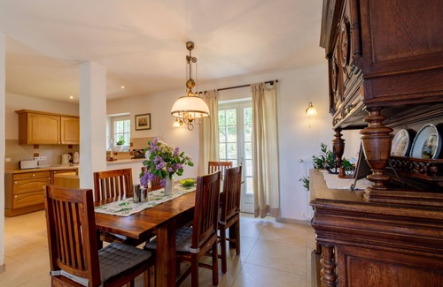 On the edge of the quaint village forest glues, amid the UNESCO Biosphere Reserve Palatinate Forest-Northern Vosges, on the way to the old forester's house, is the forester house. The house has been lovingly restored from the ground up. After 2013 and 2016, the house was also classified in July 2019 for the third time in a row according to the criteria of the German Tourism Association with five stars. The villa offers excellent opportunities for a pleasant holiday for one to eight people in two separate apartments. Depending on requirements, is available for this purpose the upper floor - (. To 4 Persons) 100 square meters with kitchen, living room with open fireplace, 2 bedrooms, shower room, guest toilet, balcony, roof terrace and carport or the whole house with about 220 square meters (up to 8 persons) with in addition to the ground floor: kitchen, living room with fireplace, 2 bedrooms, shower room, conservatory with fireplace and large terrace to the garden. This property features spacious and luxurious style rooms, wellness baths and a large roof terrace with stunning views of the surrounding wildlife reasons. The idyllic forest guarantees absolute peace and tranquility. On the patio / lawn you can enjoy the crackling of the warming oven / fireplace fire relax in the sun or in the house with a good glass of wine. Outside the door you will find a mysterious forests Sea, a unique hiking paradise, a 'paradise' for mountain bikers and cyclists as well as a unique natural environment away from the hustle and bustle of everyday life. Beautiful and exciting days and cozy evenings and restful nights await you.