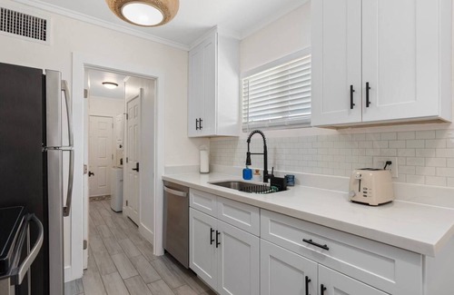 This exceptional one-bedroom retreat in Downtown Phoenix is ideal for both business travelers and couples seeking a secluded escape. Situated within a private, gated property, it offers stylish appointments and a magnificent backyard. Imagine relaxing under the pergola beside a cozy fire with your favorite beverage, or enjoying outdoor games in the spacious yard.