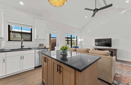 Step into a world of modern comfort and elegance at Eagle’s Landing, located right in the heart of Fredericksburg, Texas. This stunning retreat is crafted for your relaxation and adventure, offering a seamless blend of style and convenience. As soon as you walk in, you’re greeted by an open-concept kitchen and living area bathed in natural light. Picture yourself sinking into a plush, cozy sofa after a day of exploring Fredericksburg’s famous wineries and charming boutiques. And when it’s time to relax, the large flat-screen TV is perfect for your favorite shows or a movie night in absolute comfort. Plus, the living room features a convenient sofa sleeper that can accommodate an additional 2 guests, making this retreat perfect for family or friends.