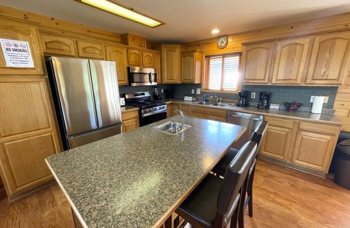 The main floor offers two bedrooms (each with a queen bed) that share one of three full bathrooms. Lounge the weekend away in the spacious living room which is adequately equipped with a stone wall gas fire place and a large flat screen TV. The great room also houses the dining area - featuring a custom log dining set - and fully stocked kitchen with stainless steel appliances and a wine cooler to keep Mom's favorite Zinfandel fresh.