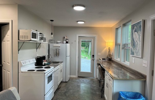 Open living area and kitchen. Set up with a queen bed in the living area so guests can wake up with view of the water from the window. Living area has sofa. Kitchen has 2 bar stools at counter to eat while looking out. The whole living area features plenty of windows to maximize view of trees and water (in summer water is peek a boo because of trees).