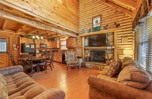 Looking for a large cabin for your family/group that sleeps 13 with one of the best in cabin game rooms in the Smokies? Eagles Roost Cabin features four bedrooms, four full and one half bath, Two, Queen size sleeper sofas with Gel foam mattress, six flat screen TVs, and large outdoor Hot Tub, all in a three level 2000+ sq. ft. Cabin. The master bedroom features a Aspen Log queen bed, and a new master bathroom with large tiled shower and is located on the main entry floor. The top floor of the cabin features 2 bedrooms, with Log furniture and both with their own private bath and queen beds. The fourth bedroom is located on the lower level; it is smaller and has a Full/Twin Bunk Bed and flat screen TV. Now to the rest which includes a Fully supplied kitchen including Ice Maker, Dishwasher, Microwave, Regular and Keurig Coffee Makers, small appliances etc large screened in and carpeted porch just out the kitchen door with a natural gas grill, rocking chairs, table and chairs , living room features a vaulted ceiling, Stacked stone Gas Fireplace, Sofa with recliners on both ends and a plasma TV over the fireplace, our inviting front porch has rocking chairs and porch swing. NOW FOR THE GAME ROOM located on the lower level of the cabin! Where else can you stay and play all of the Skee/Ice ball games that your heart's desire with our full size Ice Ball Game? All for FREE! And bring your best cue sticks for a some competition with your friends on our professionally installed, 1” Slate Bed Pool table, don't worry, we have some sticks for you if you don't have them, game room also features a 60 Game Multicade Video Table, 40” Flat Screen TV, and another full bath. Just outside the door is our huge Hot Tub. Cabin also has a full size washer and dryer and a tankless water heater system for endless hot water for everyone. Eagles Roost Cabin has Cable TV and wireless internet for your enjoyment. Our driveway has off street parking for as many as 4 vehicles. It just gets better, Eagles Roost is located in Eagles Ridge Resort North in a peaceful setting but ONLY 1.3 miles to downtown Pigeon Forge at the Parkway (Main street) and less than 2 miles to The Island! What on earth are you waiting for? Reserve today!! Sorry, NO PETS allowed. We also have some twin mattresses located in the cabin for your convenience for additional guests (may be located under existing beds or storage areas). The Cabin will have a Christmas tree for the Christmas Season!