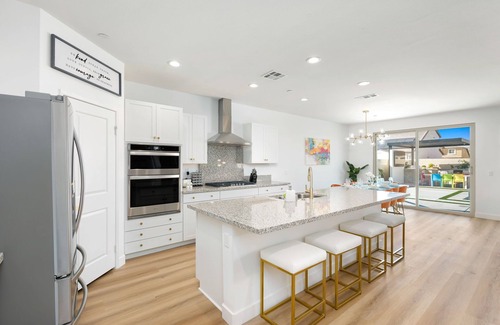 This wonderfully designed home features countless amenities including a pool, infinity spa, outdoor kitchen, fireplace, golf course, billiards, soccer table, ping pong table, corn hole & more! Everything you see is brand new.