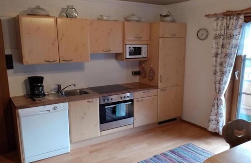 "Edelweiß", 2-room apartment on 1st floor. Bright, very beautiful and wooden furniture furnishings: upper floor: 1 room with 1 double bed, 1 pull-out bed and shower/WC. Exit to the balcony. Large, 1 double bedroom. Exit to the balcony. Large kitchen-/living room (oven, dishwasher, 4 ceramic glass hob hotplates) with 1 sleeping facility, satellite TV and flat screen. Sep. WC. Large balcony. Balcony furniture. Very beautiful view of the mountains. Facilities: Internet (WiFi, free). Parking. Please note: suitable for families. Non-smokers only. Maximum 2 pets/ dogs allowed.