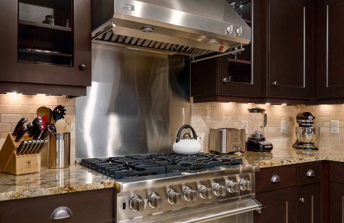 The fully stocked kitchen includes high-end appliances, a wine fridge, and all essentials for cooking. The spacious living area offers a queen sleeper sofa, built-in fireplace, and floor-to-ceiling arched windows, accommodating up to six guests.