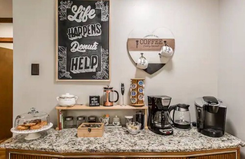 Our coffee bar is a real treat for the senses. Grind your own beans or use pre-ground for a fresh brew using a drip coffee maker or a French press. For quick and easy ,choose a variety of coffee pods for the Keurig. A cup of tea with an electric kettle is also available.
