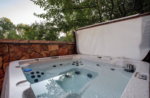 The beautiful kitchen makes prepping meals after a long day of outdoor activities a breeze. Stainless steel appliances and granite countertops complement the rustic upscale feel of this mountainside residence. Plop down on one of the large comfortable couches in the living room, perfect for unwinding with friends and family. The true highlight of this residence is the private outdoor living space. A patio closed off for privacy includes a hot tub and gorgeous stone surrounded fireplace. The family can also enjoy the pool area which is only steps away from your peaceful patio.