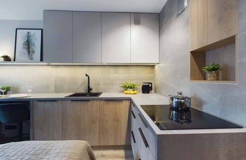 The bright and cosy studio apartement is ideal for a stay of up to two people. The main room is the living room, which has a comfortable semi-couch to save space and easily convert the space into a bedroom, a sofa, a smart TV for entertainment and access to the balcony. A table with two chairs is situated next to it, providing both a comfortable environment for dining together and for working. The kitchenette has been stocked with the necessary appliances, offering everything you need to prepare meals. There is a fridge with freezer, induction hob, oven, electric kettle and all the necessary crockery and utensils. The bathroom is fully equipped with a shower, toilet and washing machine, making this studio ideal for longer stays. This bright and comfortable flat is ideal for those who appreciate comfort and functionality. A complimentary toiletries, towels and bed linen are provided for guests to start their stay.