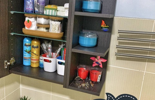 My kitchen is complete with fridge , stovetop, microwave. rice cooker, electric kettle, bread toaster, a mini coffee maker dinnerware, cutleries and utensils. The pots and pans and ladles are also available for cooking. There’s also available coffee, teas, sugar and creamer when needed..