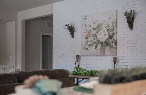 This vibrant and spacious living area is perfect for cozying up by the fireplace or binge watching your favorite show after a long day. Our HDTV provides everything from Netflix, to Hulu, and Disney+ so don’t be afraid to sit back, relax, and make yourself right at home in this charming living space!
