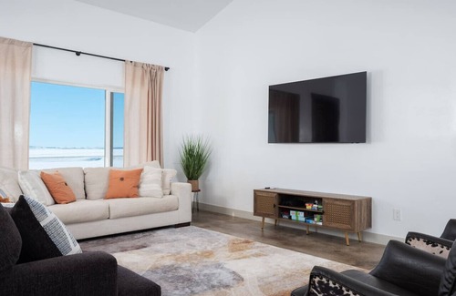 The primary bedroom boasts a king bed and an en-suite bathroom with a luxurious soaker tub. There are also two additional guest rooms, each with their own en suite bathrooms. Queen sofa sleeper in the living room. Home can comfortably sleep 8-12 & perfect for two families.