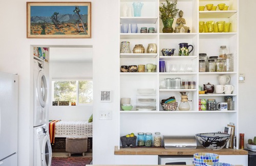 Revel in the beauty and eclecticism of the High Desert. Landers is located just North and central to Joshua Tree National Forest and Pappy and Harriets Pioneertown Palace, La Copine and home to the world famous Integratron. Stargaze or birdwatch. This house sleeps two comfortably. There is a bedroom with a king bed. The kitchen, dining and living room are open area. Single full bathroom, streaming TV and DVD player -- an i-Pod hookup, record player and wi-fi. This is a quiet and secluded property that is perfect for escaping the stress of the city.