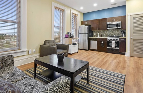 The unit features a cozy living room with a comfortable sofa, a flat-screen TV, and plenty of natural light. The bedroom boasts a plush full-size bed, a dresser, and a closet for ample storage. The bathroom is clean and modern with a shower/tub combo. The fully-equipped kitchen includes a refrigerator, stove, microwave, marble countertops, and coffee maker, along with all necessary cookware and utensils. Not to mention in-unit laundry!