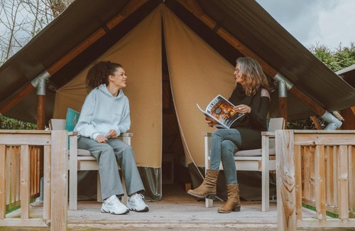 The Tiny Safari House offers everything you need for a carefree stay. The fully equipped kitchen includes a dishwasher, microwave, fridge with freezer, and a Nespresso coffee machine. The living room features a flatscreen TV, and the bathroom is fitted with a shower, sink, and toilet. There are two bedrooms: a bunk bed on the ground floor and two single beds in the small loft upstairs. Outside, relax on the veranda with outdoor furniture, or let your children sleep in the separate kids’ safari tent (non-insulated, available April to October). This accommodation is located in an auto-free area of the park, close to the restaurant and swimming pool.