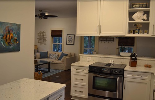 Come relax and rejuvenate with family and friends at our charming beach house. The 7th Cottage is a 3 bedroom, 3 bath cottage which boasts a fully equipped kitchen and outdoor grill. The modern kitchen is appointed with deluxe wood cabinets and white-granite counter tops. Appliances include refrigerator, stove, oven, microwave, dishwasher, and disposal. We also provide convenient appliances including a K-cup style coffee maker, toaster, and blender.