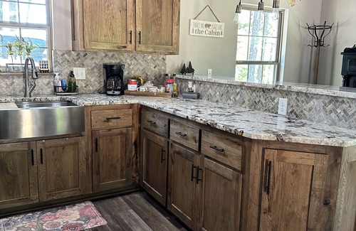 Our 2 bedroom cabin was fully remodeled a few years ago-complete with new appliances, granite countertops and many other upgrades. Still, our cabin remains a cozy & relaxing place to enjoy the wildlife & gorgeous lake view! You’ll feel like you are in the mountains amongst the pines! The towns of Grove & Jay are each just 15 minutes away. Crappie and catfish are plentiful in our cove. It is centrally located just around the corner of the popular Woodard Cove and a quick 5 minute boat ride to Shangri La Resort. (The boat dock on property is not available for guests use.) Mid America Outdoors is just 9 miles away. As a courtesy we’d like to mention that there is a home a few hundred feet away that is in the final stages of construction. This home shares the long driveway with this cabin property. There may be occasional noise, vehicle traffic and other construction related inconveniences depending on the day. Most days it’s minimal to not noticeable at all.