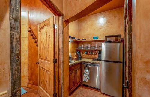 This Kiva has 1 King bed and an indoor bathroom with a shower, flushing toilet and a sink. Also inside the Kiva is a kitchenette with a small refrigerator, a sink, a dishwasher, a microwave and a Keurig coffee maker. We provide plates, cups, bowls and silverware. There is an open rooftop space that has a fire table and chairs, a gas BBQ grill and a hot tub.