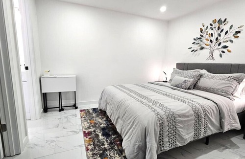 The main bedroom boasts a luxurious queen-size bed adorned with soft sheets and plush pillows, ensuring you a restful night's sleep. Additionally, you'll find a cozy corner with a mini living area perfect for unwinding after a day of city exploration, or catching up on work at the available laptop desk.