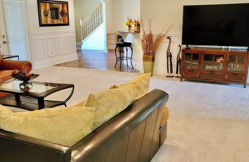 Watch the big game or your favorite movie in our spacious living room with a 65" smart TV with access to streaming services + a comfortable sectional couch, a beautifully decorated photo wall and unique seating: