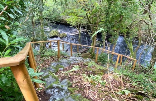 This is the first floor studio apartment in a charming hillside cottage. Own door access to stairs, landing, studio apartment and own bathroom. Parking at house. Private balcony with table and chairs overlooking owners' garden. Access to private riverside decking with table and chairs. (Please note access is by rustic stone steps and care is advised.)