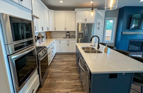 This newly renovated cabin features 6 bedrooms, 4 bathrooms, and a gas fireplace. Elevate your culinary experience in our rental cabin's gourmet kitchen, fully equipped with top-of-line appliances and spacious countertops, perfect for creating delicious meals while enjoying the serene lake view. There are two large comfy common areas with spacious seating to rest and recharge. Enjoy a movie on one of the large flatscreen TV's or play games with family and friends.
