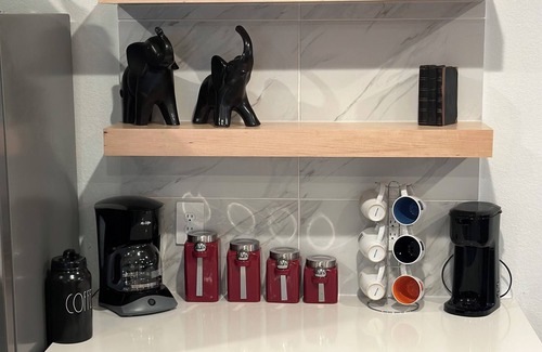 The well-equipped kitchen includes spacious gray cabinets and high-quality stainless steel and black appliances. You'll find all the necessary small appliances, dishes, and cookware for your convenience.
