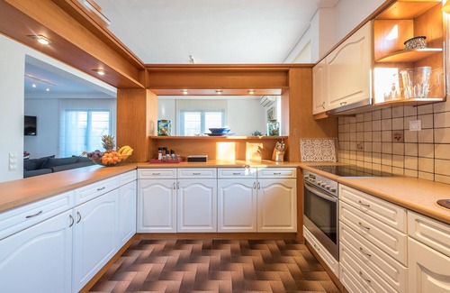 This specific apartment (130m2) on the first floor includes three bedrooms, two bathrooms, one living room, a fully equipped kitchen and opens to a spacious balcony. The apartment can host up to 6 people. Guests, besides the apartment, can exclusively use the pool and the garden. Guests can communicate for anything they need through the Airbnb platform or via phone, which we will provide to them before their check-in. To access the apartment and the garden, there are one-flight stairs.
