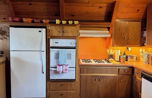 Step back in time and enjoy all the vintage touches of this Mid-Century Modern A-frame time capsule in Running Springs nestled perfectly between Lake Arrowhead and Big Bear. Enjoy hiking, the nearby lakes in the summer and skiing/snowboarding in the winter. Relax on the large deck high up in the trees, or curl up on the couch with a mug of hot cocoa in front of the Carousel fireplace. Grill up dinner out on the deck, listen to records, play board games and enjoy spending time in this sweet retro vibe.