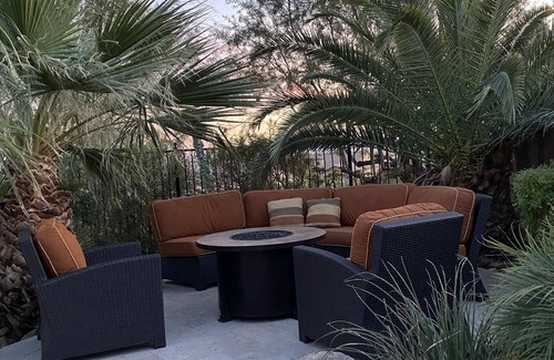 Backyard has a private pool/spa with covered outdoor kitchen/BBQ, firepit, putting green and Cornhole/Bocce Ball area. Pool/Spa heat is extra $40/day. Pool heat is up to 85 degrees. Spa is 100 degrees. Backyard is full sun all day with amazing sunsets!