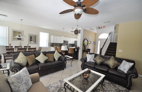One of the lovely features of our Florida villa is the imposing staircase as you enter and the beautiful lounge area that overlooks the pool. Here you can watch cable tv on our big screen, see a dvd or simply listen to the music system.